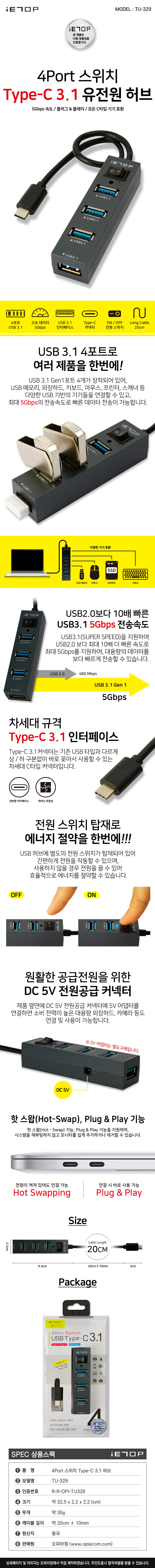 이탑 TU-329 C타입 유전원허브 4포트 전원스위치탑재